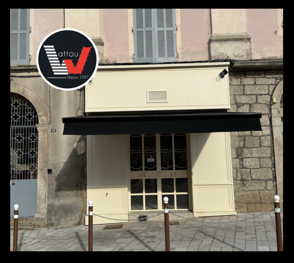Conception et pose d’un store coffre entièrement noir pour habiller la façade bois d’un commerce sartenais